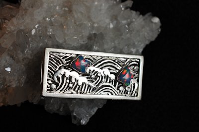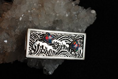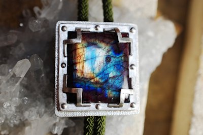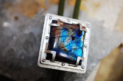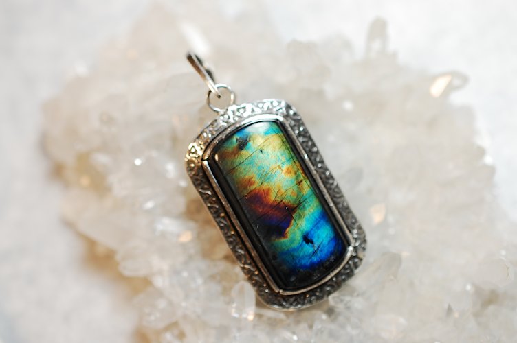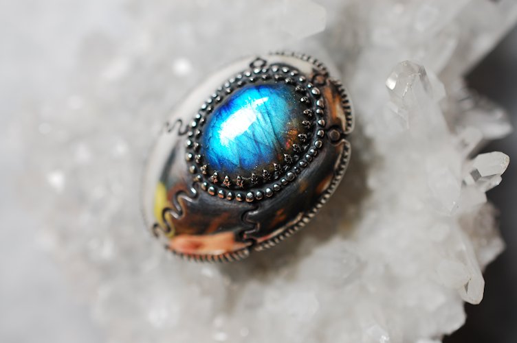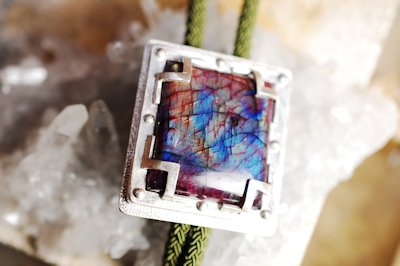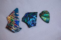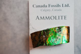 アンモライト (ammolite) はオパール状の遊色を持った生物起源の宝石で、アメリカ合衆国とカナダのロッキー山脈の東斜面にのみ産出する。アンモナイトの化石からなり、主として霰石(真珠を形成するものと同じ)からなる。琥珀や真珠などと同じく生物活動によって作り出された宝石の一つである。Wikipediaより・・・です。