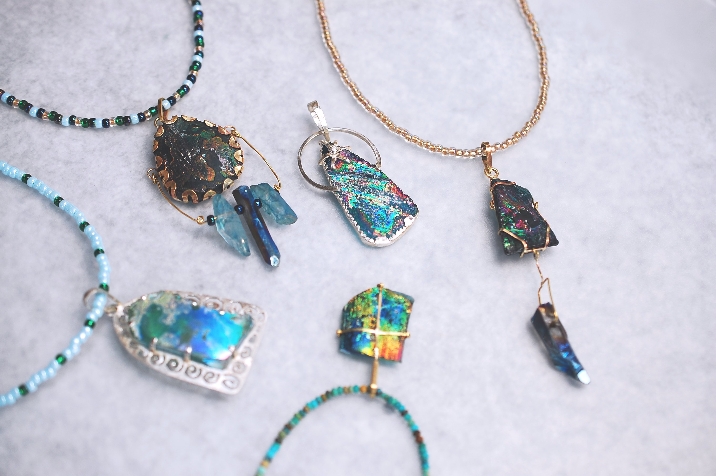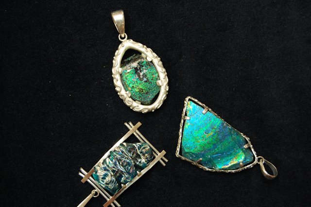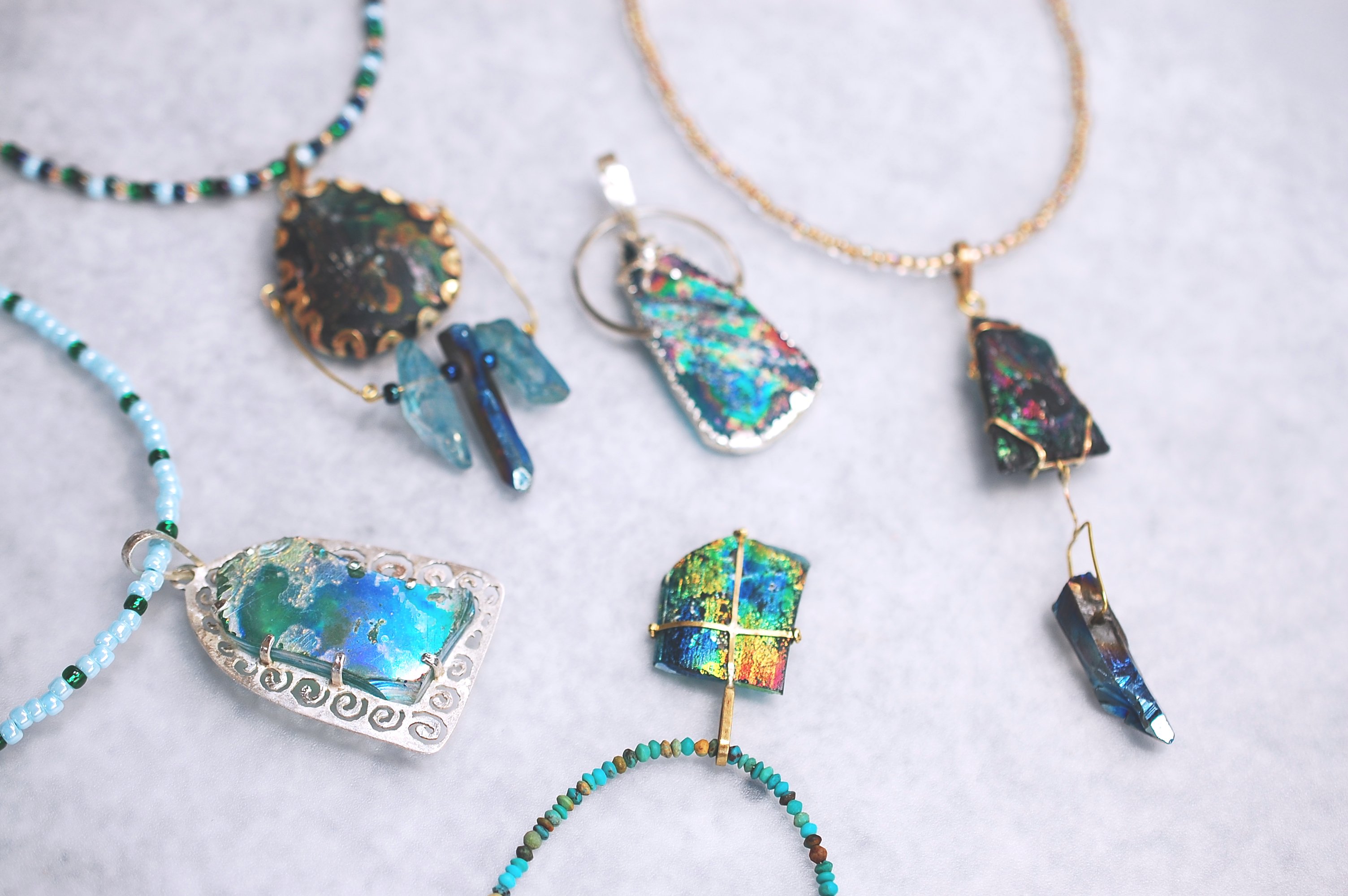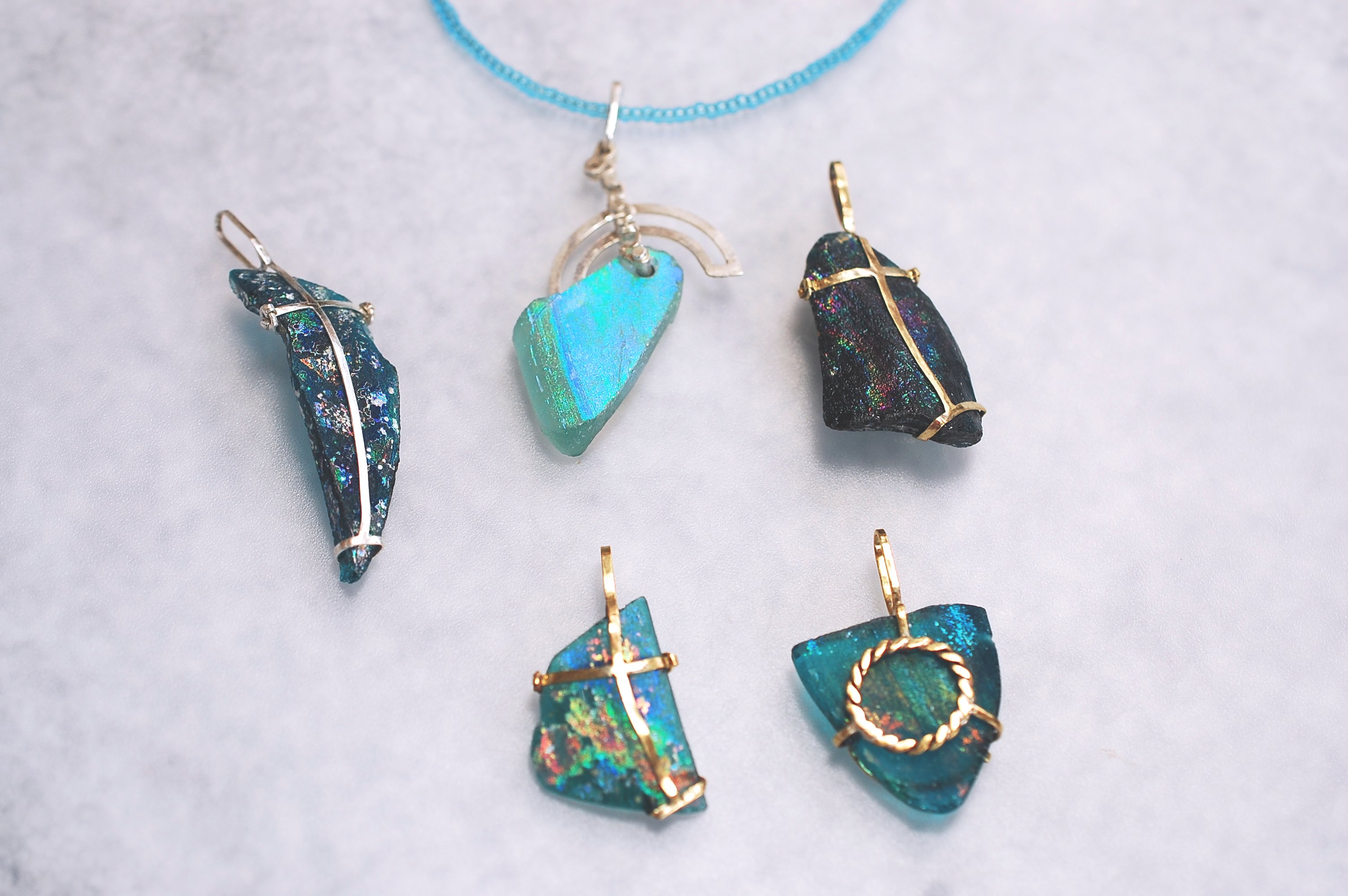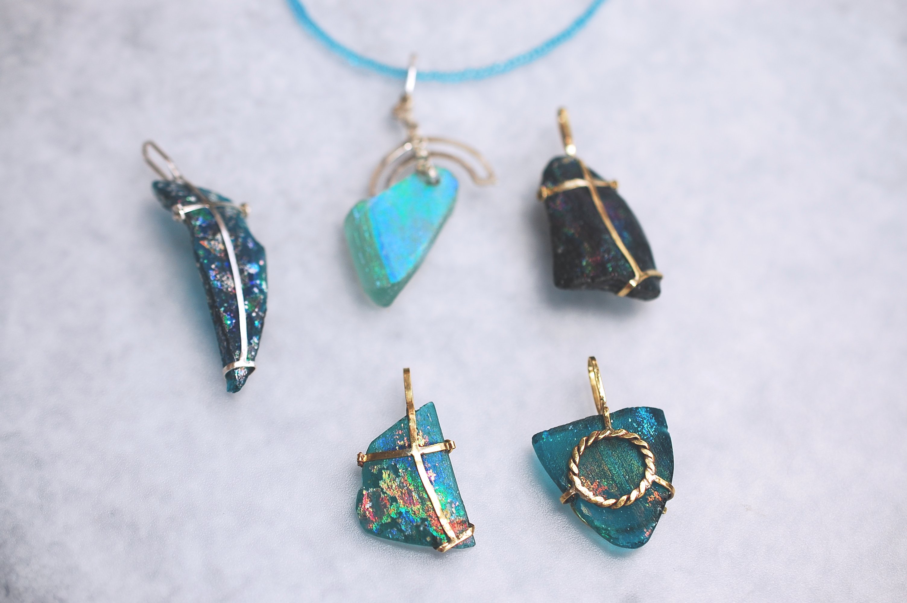 ローマンガラスは、力を加えると割れるため、留める金具や、仕様を工夫した私のオリジナルの作品となりました。詳しくは、iichiをご覧ください。