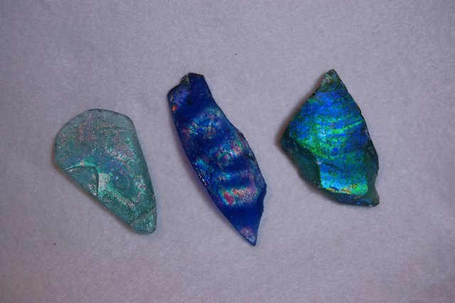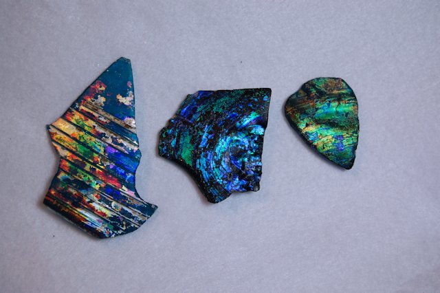 地中に埋もれていたローマンガラスには、表面が七色に光る現象が現れているものがあります。銀化現象と呼ばれ200年~500年以上、乾燥した限られた環境の土に埋まることにより起こる、ガラスの成分が化学反応を起こした風化現象です。銀化したガラスは、光の当たり加減によって様々な色合いに変化します。人工的には決して再現できない、神秘的な美しさが感じられます。